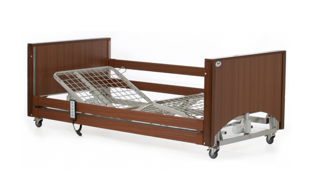 Available in oak or walnut, it accommodates extra high side rails and a 20cm length extension kit for customisation, making it versatile for various user needs. With a maximum safe working load of 200kg, it’s engineered for longevity and patient dignity, compatible with high-risk Sensaflex mattresses to enhance pressure redistribution and comfort.